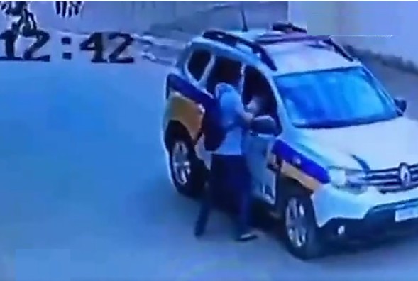 Imagens de câmeras de segurança de estabelecimentos da região mostram o momento em que o rapaz sinaliza para que a viatura da Polícia Militar pare. Logo em seguida, o homem começa a desferir golpes contra o agente sentado no banco do passageiro.